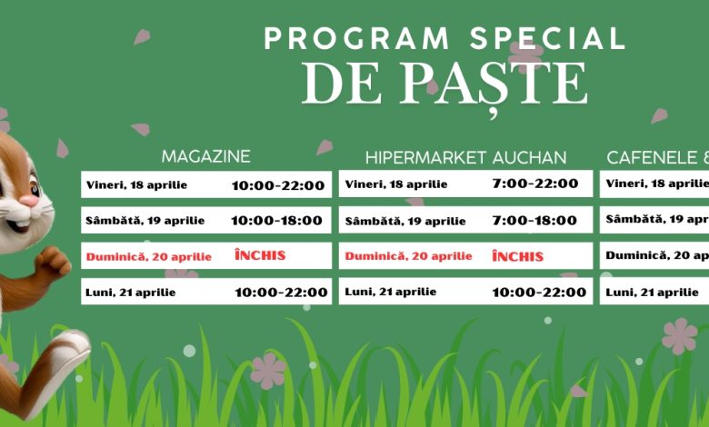 Și hypermarket-ul Auchan este deschis vineri, de la ora 07.00 până la 22.00, și sâmbătă, în intervalul orar 07.00 – 18.00. Duminică este închis, însă de luni se redeschide, conform programului obișnuit.