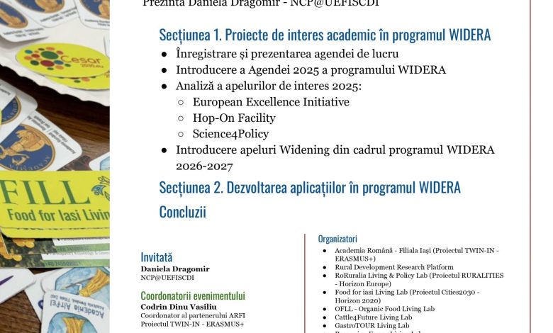UEFISCDI – Punctul Național de Contact pentru Horizon Europe, în parteneriat cu Academia Română – Filiala Iași și Centrul CLIPP CESAR2030, are plăcerea de a vă invita să participați joi, 10 iulie 2025, ora 12:00, la Academia Română – Filiala Iași, Str. Carol I, nr. 8, Copou, la atelierul de scriere a propunerilor de proiecte Horizon Europe – WIDERA, dedicat dezvoltării de propuneri competitive pentru apelurile 2025–2026.