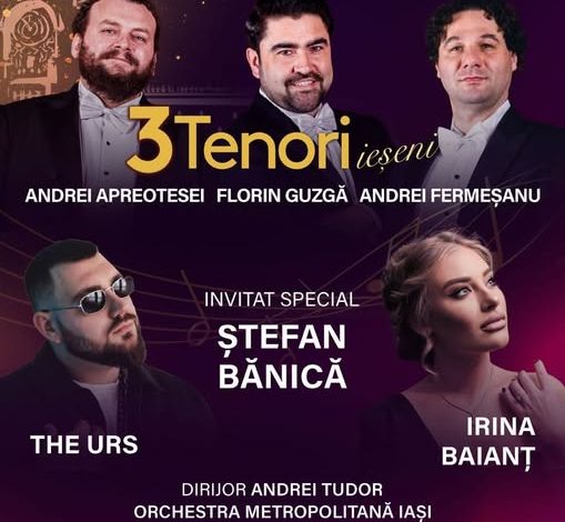 Publicul va avea ocazia să îi asculte pe cei 3 Tenori Ieșeni – Andrei Apreotesei, Florin Guzgă și Andrei Fermeșanu, acompaniați de Orchestra Metropolitană Iași, sub bagheta dirijorului Andrei Tudor.