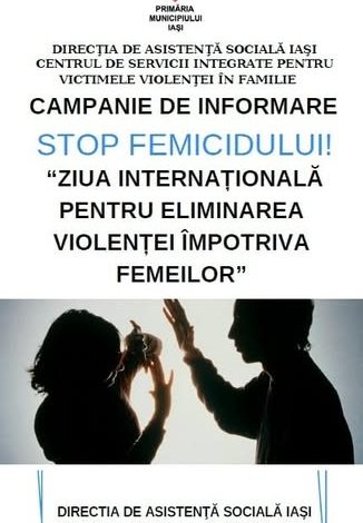 Primăria Municipiului Iași, prin Direcția de Asistență Socială, marchează Ziua Internațională pentru Eliminarea Violenței Împotriva Femeilor (25 noiembrie) prin campania „STOP Femicidului!”, o inițiativă dedicată informării și sprijinirii femeilor din comunitate.