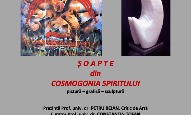 Tema propusă de sculptorul-scenograf Cosmin-Mihai IAȚEȘEN și de pictorul-grafician Liviu ȘOPTELEA prin intermediul expoziției de pictură, grafică și sculptură ne sugerează o călătorie vizuală de la naștere la viață sau la moarte. Metamorfozele ființei umane trecând prin diferite aspecte, stări sau ipostaze, de la bucurie, teamă, uimire în lumină și sens reprezintă o cosmogonie spusă discret, mistic, aproape în șoaptă. Expoziția ȘOAPTE DIN COSMOGONIA SPIRITULUI deschide o fereastră către tensiunea dintre concret și abstract, dintre planul vizibil și cel simbolic. Lucrările celor doi întruchipează vocile tainice ale creației fiecăruia în mesaje subtile prin care conștiința își dezvăluie originea și sensul, două lumi plăsmuite în universuri interioare ce prind formă, culoare și vibrație. Îngeri literați, Rădăcini, Zbor spre crucea inimii, Îngerul pădurii, Funeralii pe mare, Metamorfoze, Altă călătorie, Ecranul călător sunt doar câteva lucrări în tehnica acrilyc / pânză realizate de pictorul Liviu ȘOPTELEA. Invocație, Arhetipuri, Măști în stil propriu, Zbor spre Infinit, Strigăt angelic, Călătorie în timp, Ecleziastică, Interiorizare, Zarathustra, Cărturarul, Stări I, II, III, Ascensiune, Flacăra speranței transmit vibrația materială a substanței minerale, lemnoase ori metalului din care au fost sculptate lucrările lui Cosmin IAȚEȘEN.