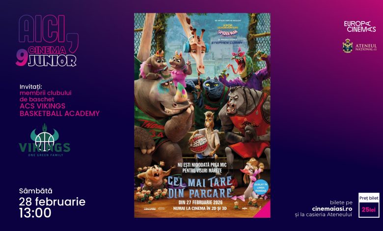 Prima ediție din 2026 a proiectului „Aici, Cinema Junior” marca Cinema Ateneu va avea loc sâmbătă, 28 februarie 2026, de la ora 13:00 în Sala Mare de Spectacole „Radu Beligan” (Ateneul Național din Iași). Cei mici și părinții sunt invitați să ia parte la vizionarea în premieră a filmului „GOAT – Cel mai tare din parcare” (regia Tyree Dillihay) și la o discuție despre importanța sportului, disciplină și apartenență cu membrii clubului de basket local ACS VIKINGS BASKETBALL ACADEMY.