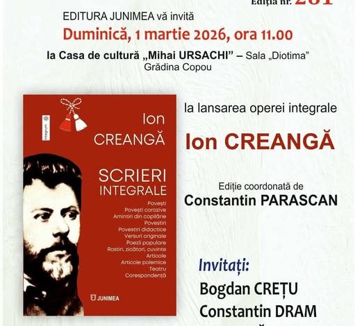 Ediția nr. 261 a Clubului Junimea-Scriptor va avea loc duminică, 1 martie 2026, ora 11, la Casa de Cultură ”Mihai Ursachi” a Municipiului Iași. În cadrul acestei ediții va avea loc lansarea operei integrale ION CREANGĂ, ediție coordonată de Constantin Parascan. Invitați: Bogdan Crețu, Constantin Dram, Mircea Păduraru. Amfitrion: Simona Modreanu. Organizatori: Editura Junimea, Revista Scriptor și Filiala Iași a Uniunii Scriitorilor din România.