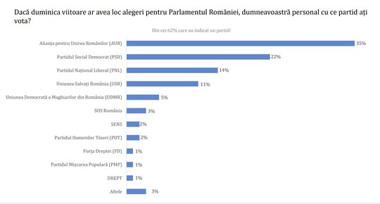 AUR se situează pe primul loc în topul opţiunilor pebtru Parlament, cu o cotă de 35%, urmat de PSD – 22%, PNL – 14%, USR – 11%, UDMR – 5%, SOS România 3%.