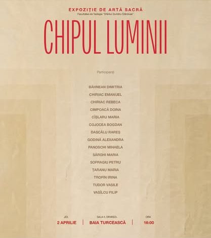 „În perioada pregătitoare a sărbătorii Învierii Domnului, specializarea ,,Artă Sacră” a Facultății de Teologie Ortodoxă, organizează expoziția „Chipul Luminii”,care cuprinde lucrări ale cadrelor didactice, studenților și masteranzilor Secției de Pictură, la Centrul Internațional de Artă Contemporană- Baia Turcească, Iași. Expoziția va putea fi vizitată în perioada 02-10 aprilie, conform programului.