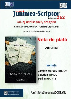Joi, 23 aprilie 2026, la sediul Editurii Junimea din parcul Copou va avea loc lansarea cărții Nota de plată, autor Adi Cristi. Apărut la Editura Junimea, volumul va fi prezentat de Șerban Axinte, Cassian Maria Spiridon și Valeriu Stancu. Amfitrion: Simona Modreanu.