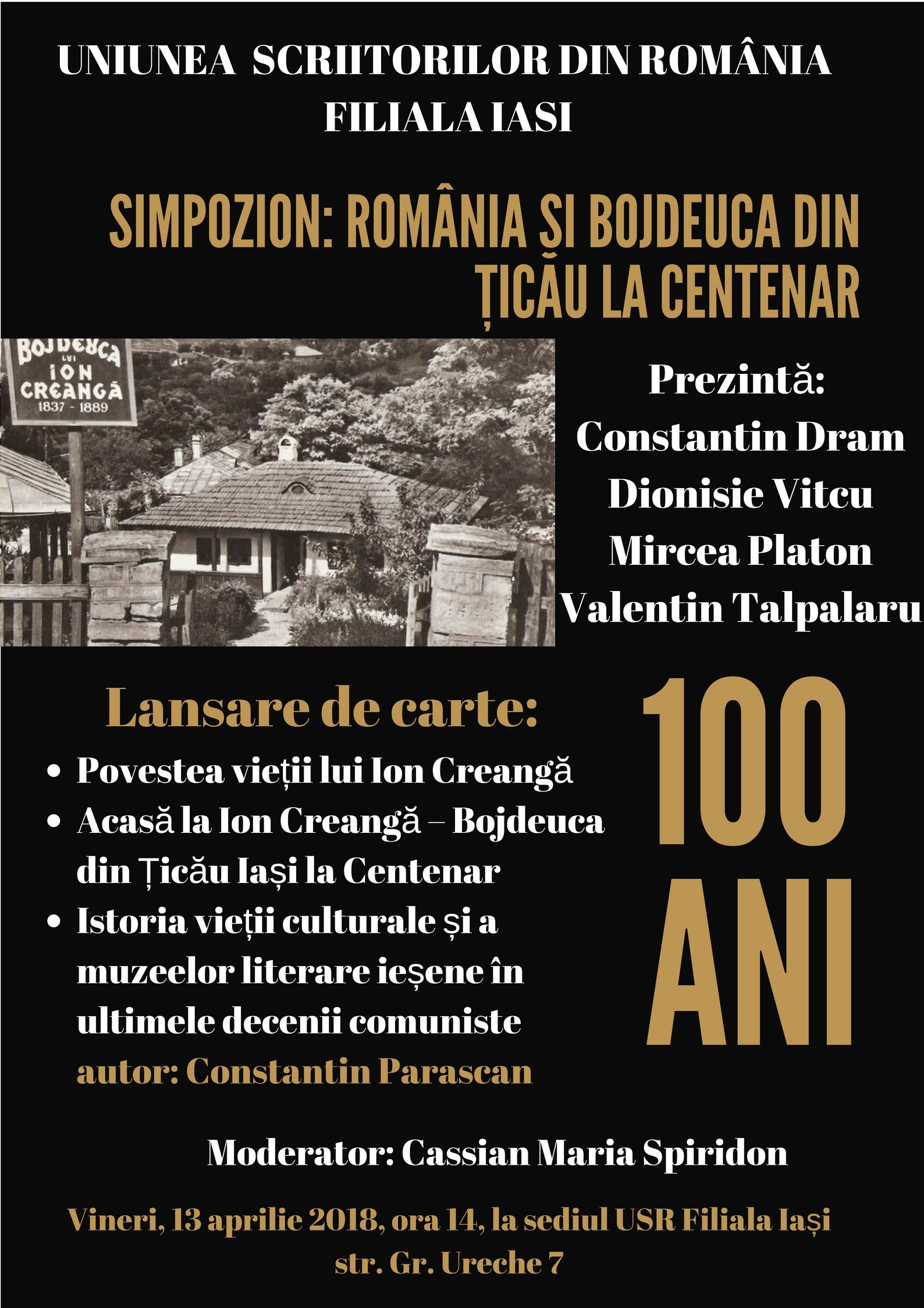 Uniunea Scriitorilor din România – Filiala Iași vă invită vineri13 aprilie 2018, ora 14, la simpozionul România și Bojdeuca din Țicău…