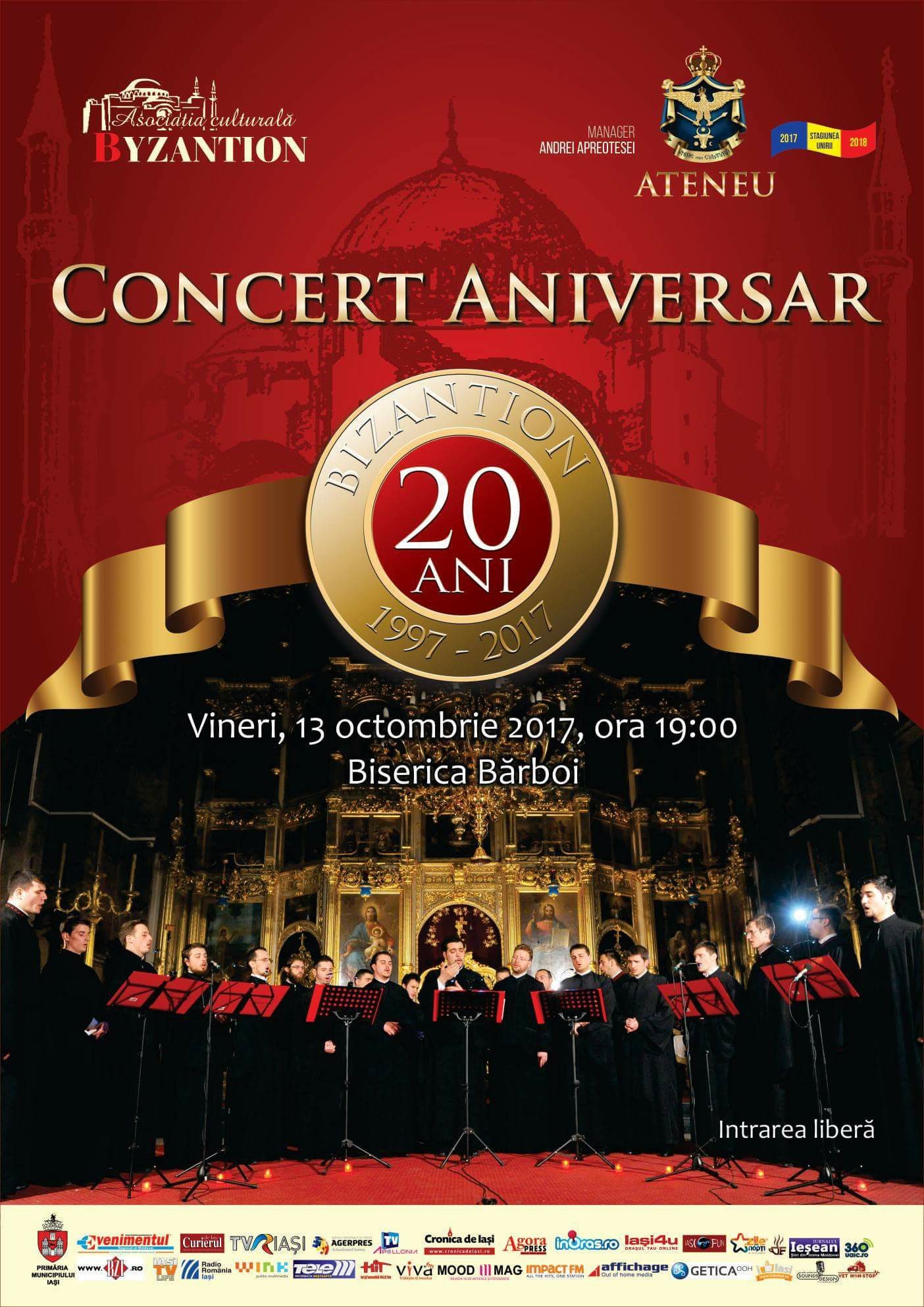 Corul Byzantion împlinește în aceste zile 20 de ani de activitate. Cu această ocazie, vineri, 13 octombrie, la ora 19.00,…